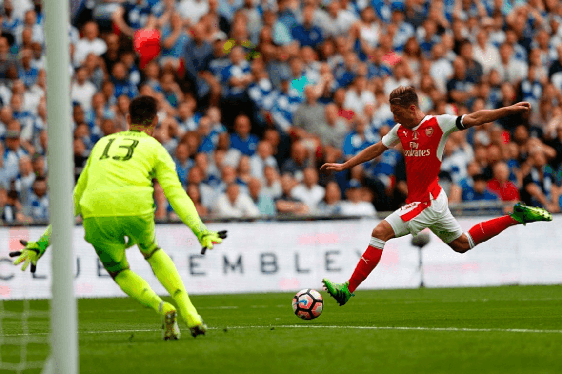 Impresionante contragolpe y reacción del Arsenal. Olivier Giroud, quien acababa de entrar por Welbeck, ingresa al área en una diagonal y envía un centro cruzado al centro de la misma donde encuentra a Aaron Ramsey. El galés cabecea sin marca la pelota y pone el segundo para los Gunners, que vuelven a saborear el título.