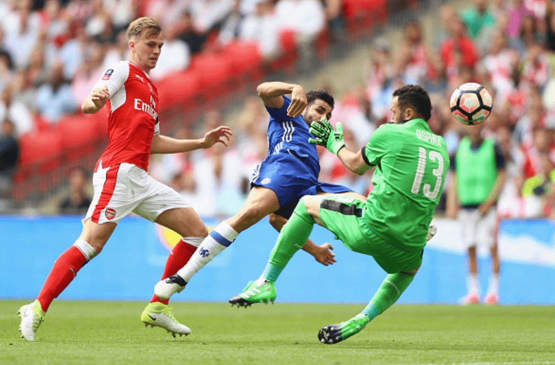 El portero colombiano David Ospina quedó herido y fue atentido oportunamente luego de un choque con Diego Costa, que tuvo la primera chance para los Blues. Ospina detuvo bien la pelota y evitó el empate.