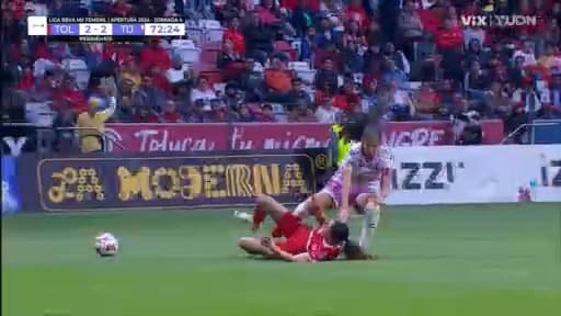 La defensora de Toluca cortó el viaje de la bola, pero su rival le dejó un pisotón en el tobillo y un rodillazo en la cara, los médicos entran a revisarla.