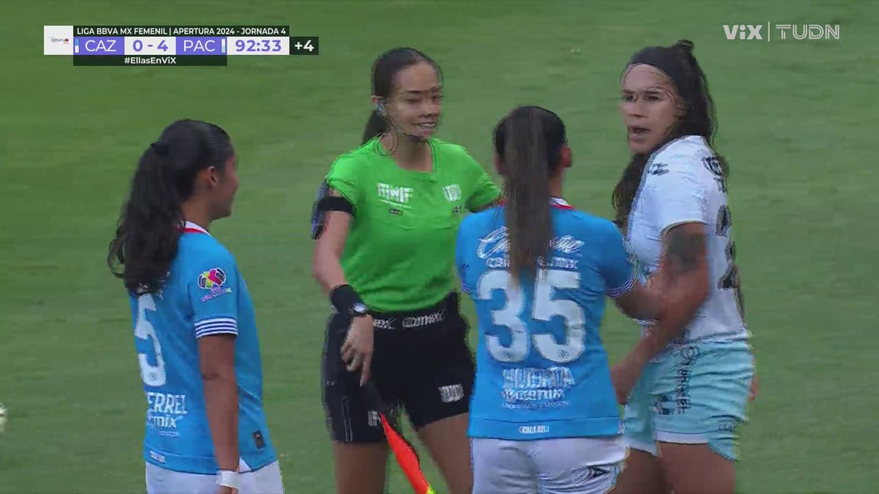 Ambas jugadoras vieron el cartón preventivo. Claudia por empujar y Danya por cómo la baja al césped y por la risa burlona.
