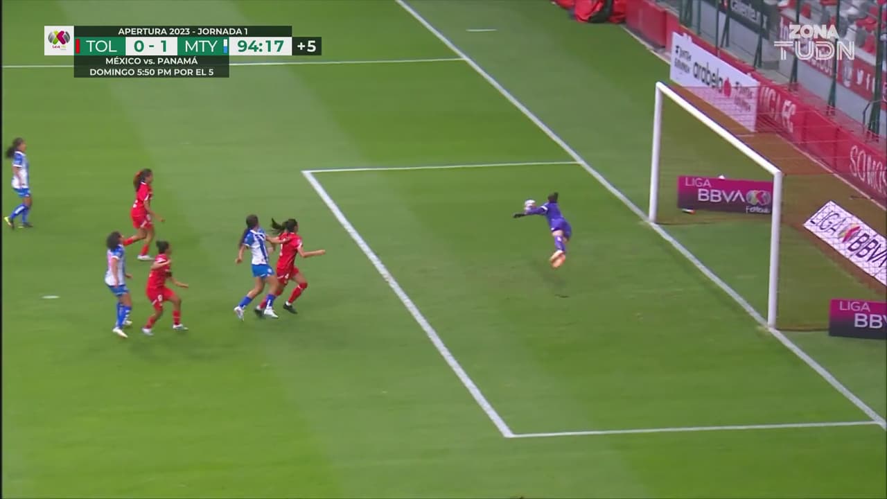 En jugada que nace a balón parado, Natalia Colín remata de cabeza y guardameta se estira para mandar el balón a tiro de esquina.