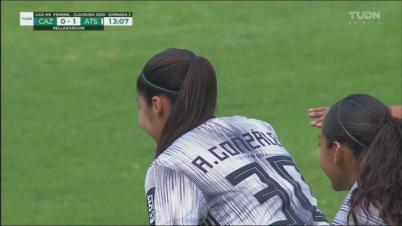 La delantera rojinegra saca potente zurdazo para vencer a la portera celeste Karla Morales.