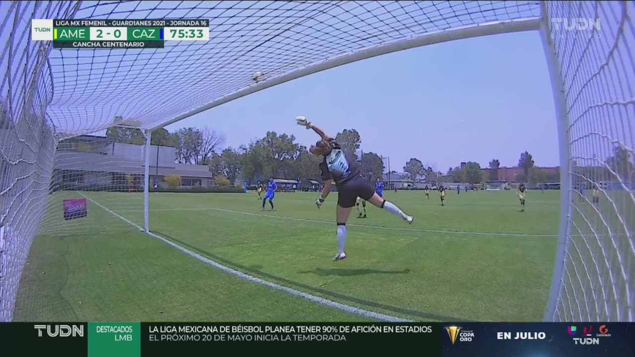 Sin embargo, al minuto 83 Rebeca Villuendas, quien había ingresado de cambio, le pegó de larga distancia para sorprender a la portera americanista y acercar a las azules con un golazo.