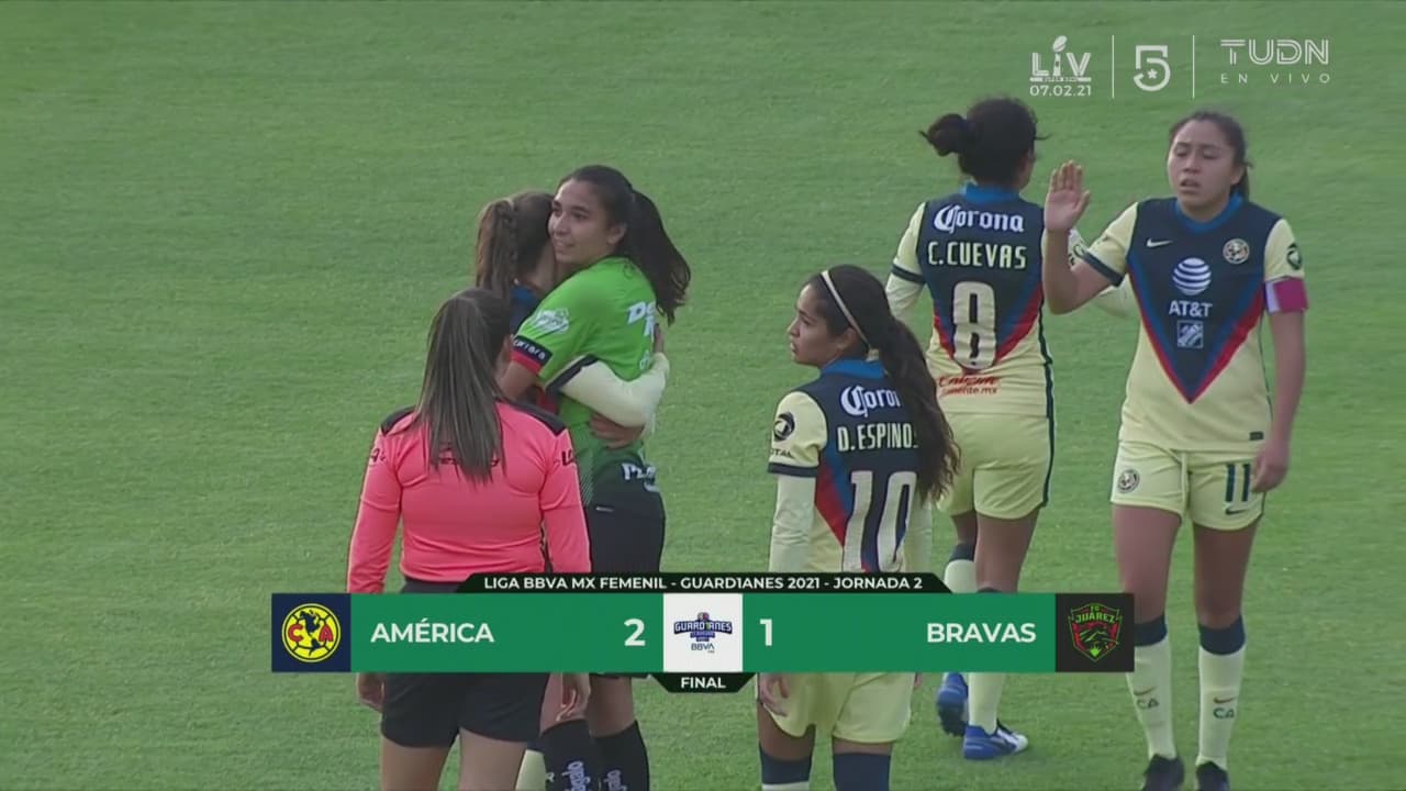 La espectacular anotación de Eva González Tate y los debuts de Mayra Pelayobernal, Fernanda Piña y Daniela Frank protagonizaron el primer triunfo del Guard1anes 2021 BBVA MX del América femenil, tras derrotar Bravas de Juárez (2-1).