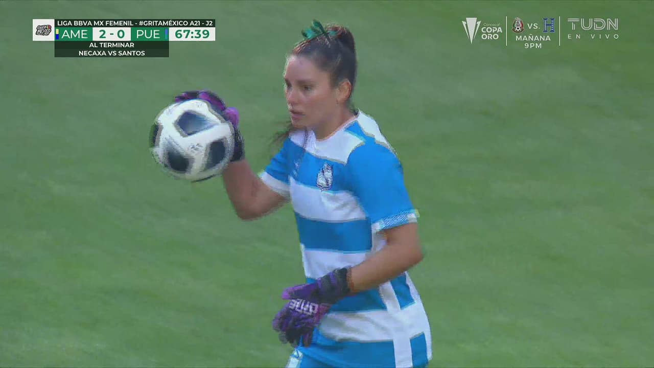 Se enredan en defensa, pero Jocelyn Orejel y Daniela Flores no la logran empujar, al 68'.