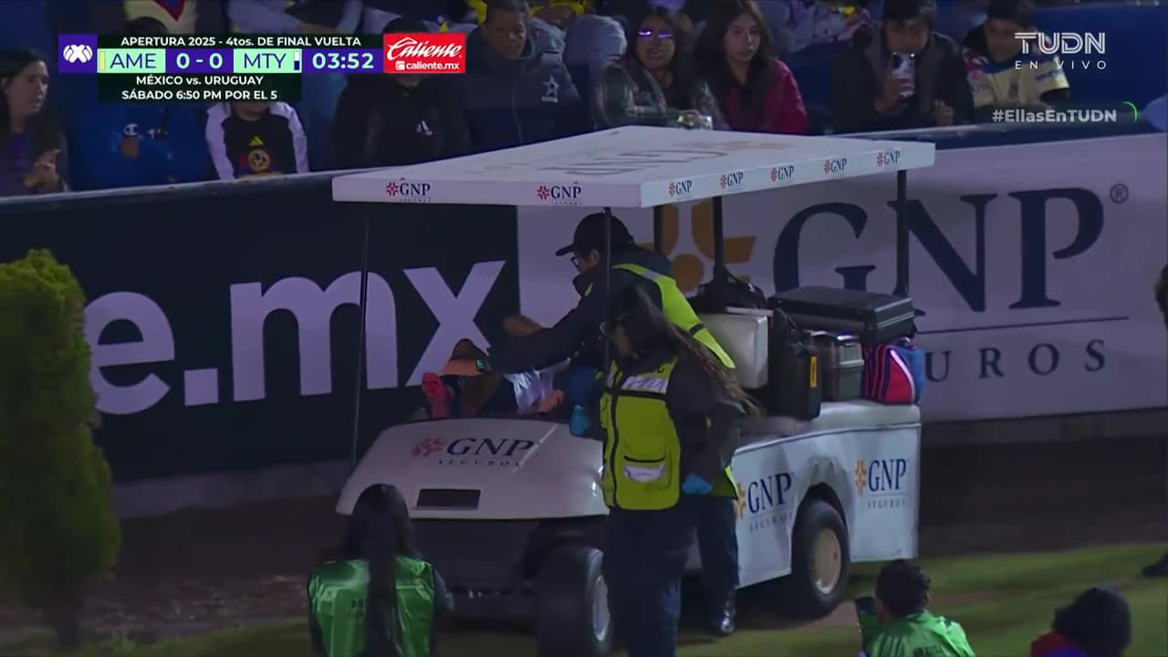La mediocampista del Monterrey protagonizó un momento insólito, ya que cuando fue retirada del campo, el carrito casi la tira y tuvo que bajar la pierna para evitar estamparse contra el suelo, acción que pudo haber empeorado su lesión.