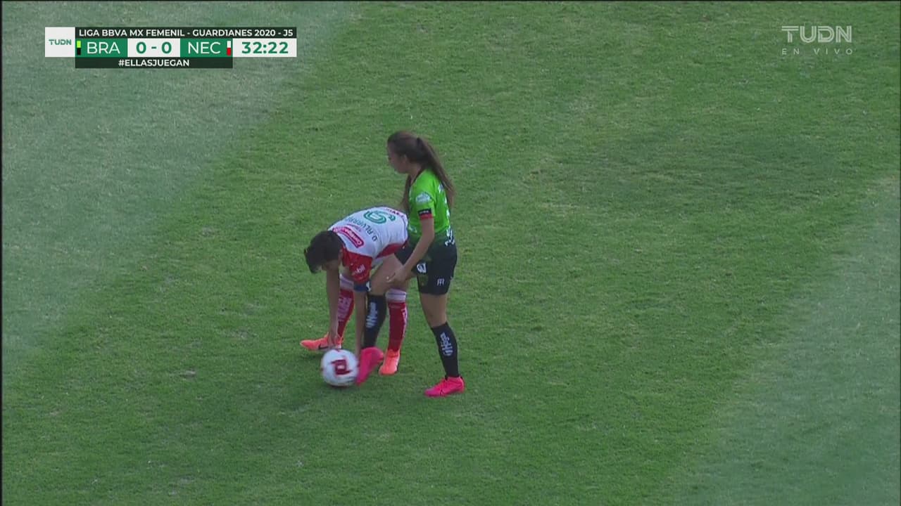 La jugadora del Necaxa se disponía a tomar el balón, pero la de las Bravas se lo punteó, le pegó en los dedos y por ello se llevó la amarilla al 31’.