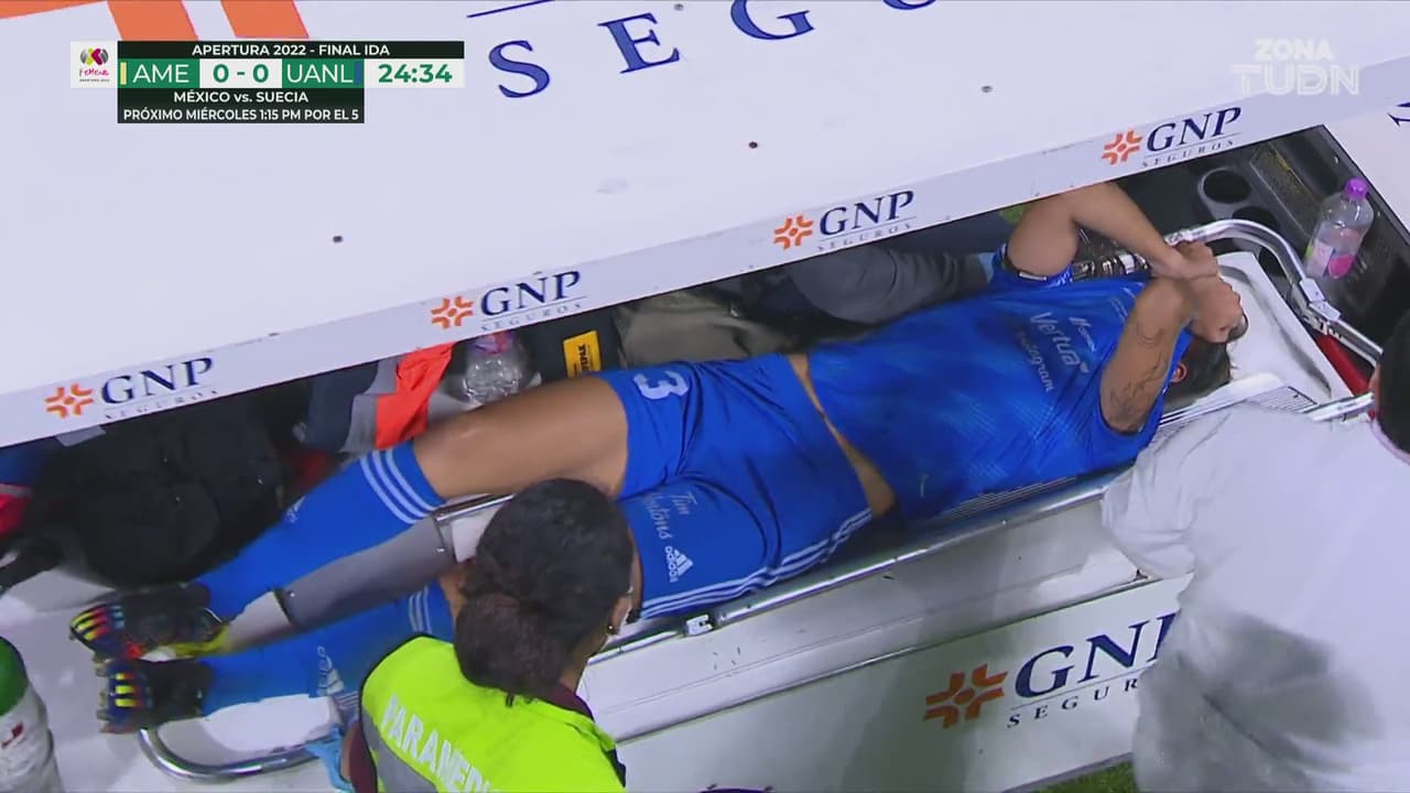 Cuando la defensa peleaba el balón con Hernández, su pierna queda atorada y tiene que salir en el carrito.