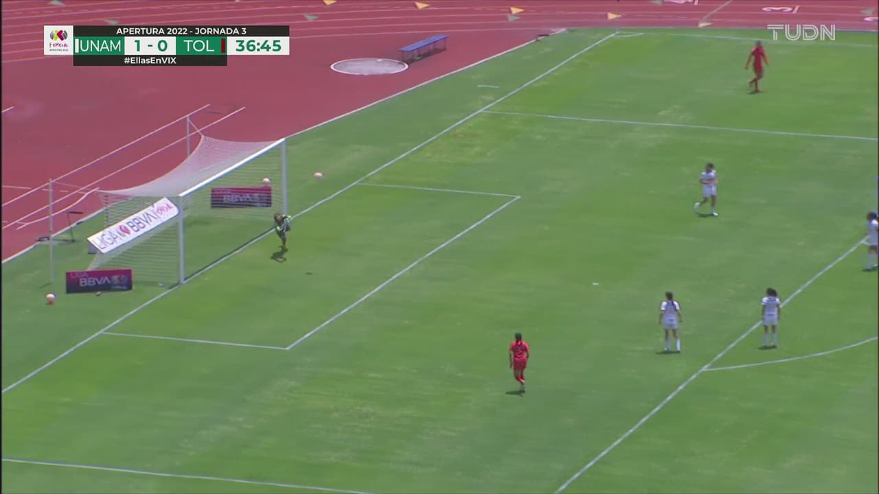 La jugadora del Toluca no se la pensó dos veces para intentar desde tres cuartos de cancha por encima.