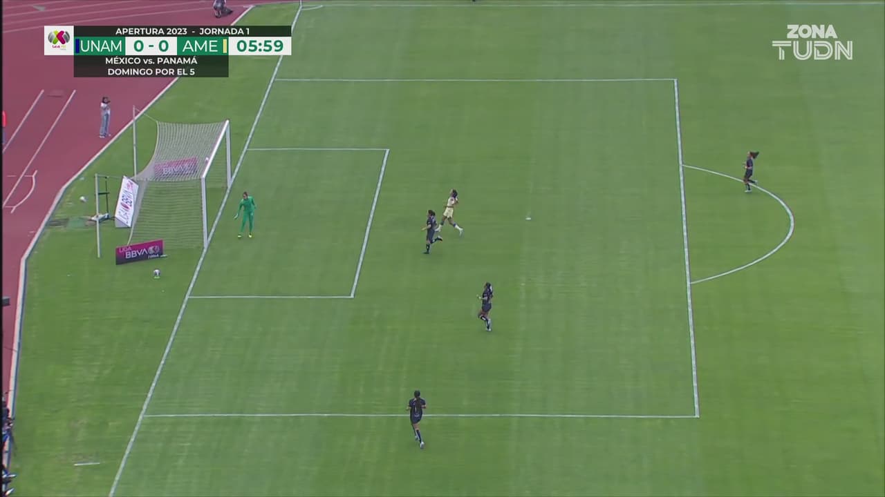 Sabrina Enciso llevaba mucha velocidad con el balón para habilitar a González, pero Dirce se atraviesa y salva a Pumas.