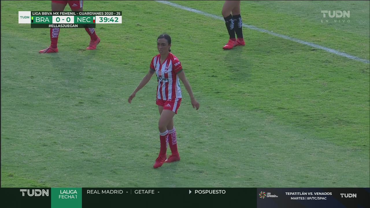 La jugadora del Necaxa se internó al área y bombeó ante la salida de la portera, pero su tiro fue a pegar en el metal al 40’.
