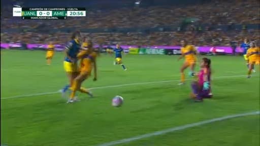 La delantera del América buscó definir un balón de Luebbert, pero Greta Espinoza mando a tiro de esquina.