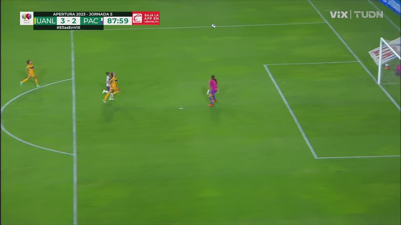 La jugadora de Pachuca recibe gran pase y busca sorprender a la guardameta de Tigres, sin fortuna. El balón pasa por encimar del arco.