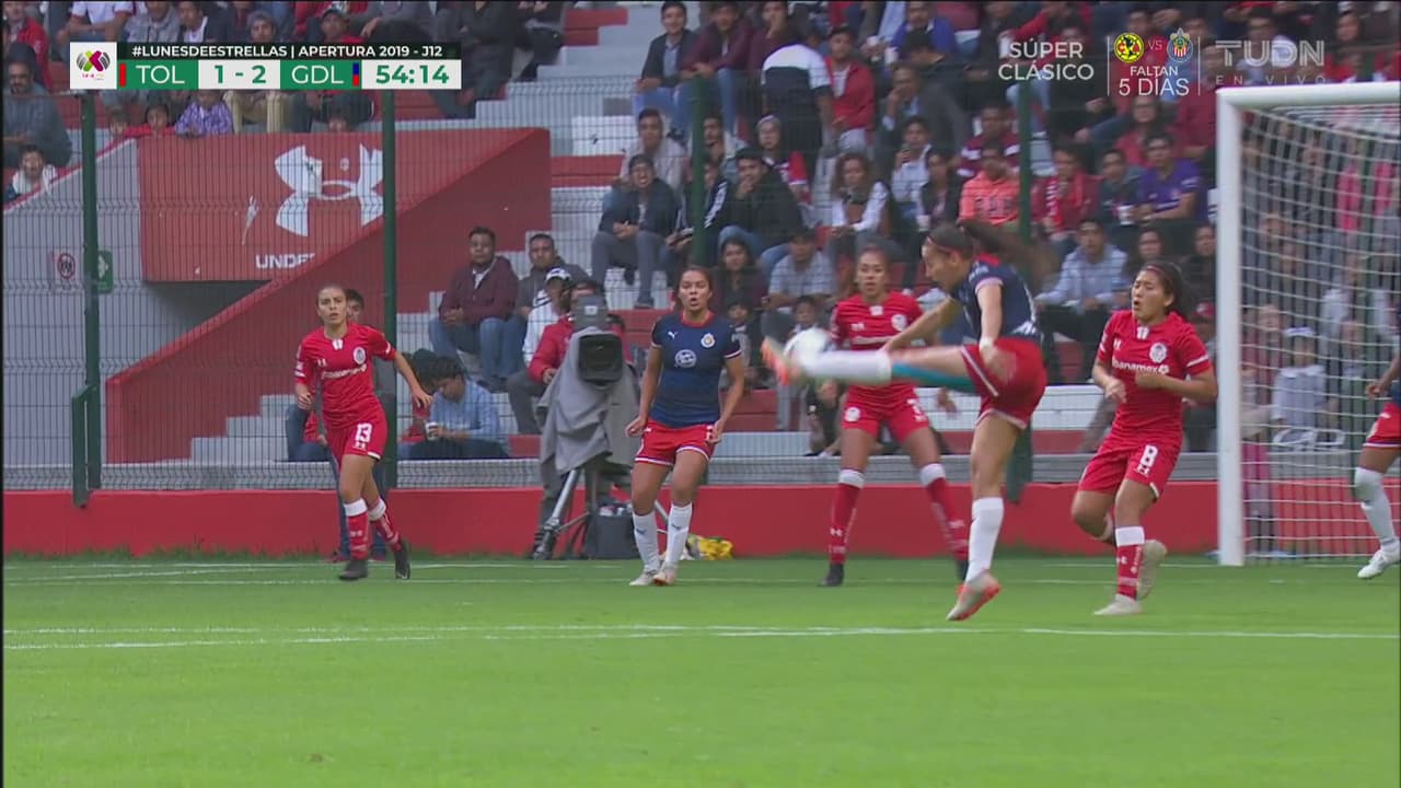La zaga de Toluca no puede despejar y Diana Rodríguez aprovecha para poner el 2-1 para Guadalajara.