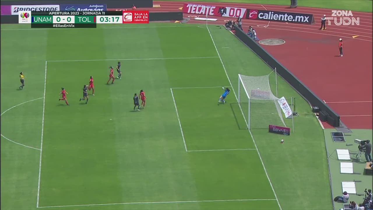 Buen remate de Desiree hacia la cabaña de las mexiquenses que estaba bien resguardada por Miriam, recostando para alejar el balón.