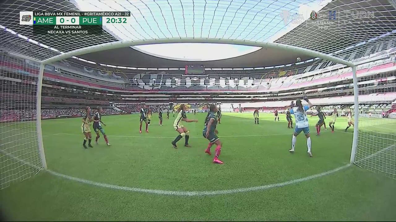 Le llega a la jugadora del América y el doble cabezazo no es correcto, al minuto 21.