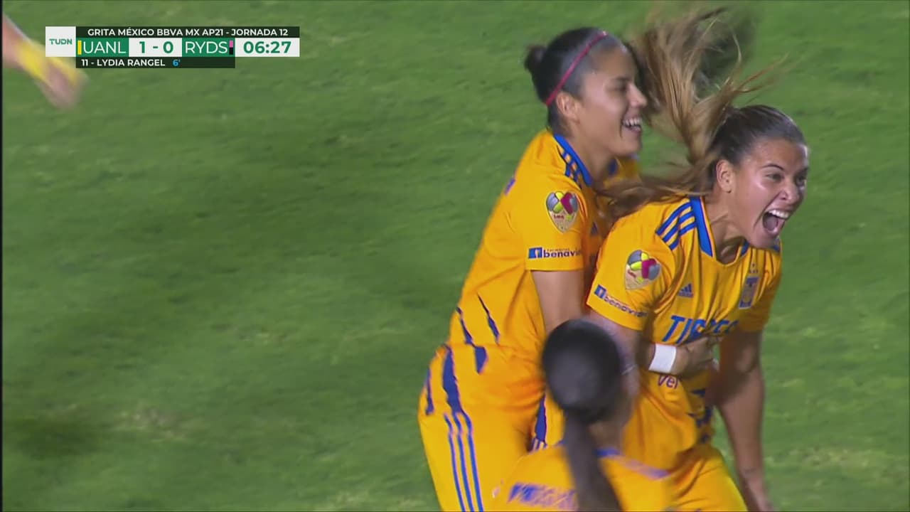 La mediocampista de Tigres recibió dentro del área el balón tras un tiro libre y sacó el remate pegado al palo al 5’.