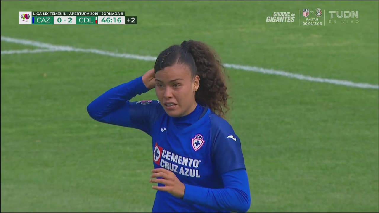 Alejandra Curiel le gana a la defensa de Chivas y cabecea sola, pero el balón sale desviado.