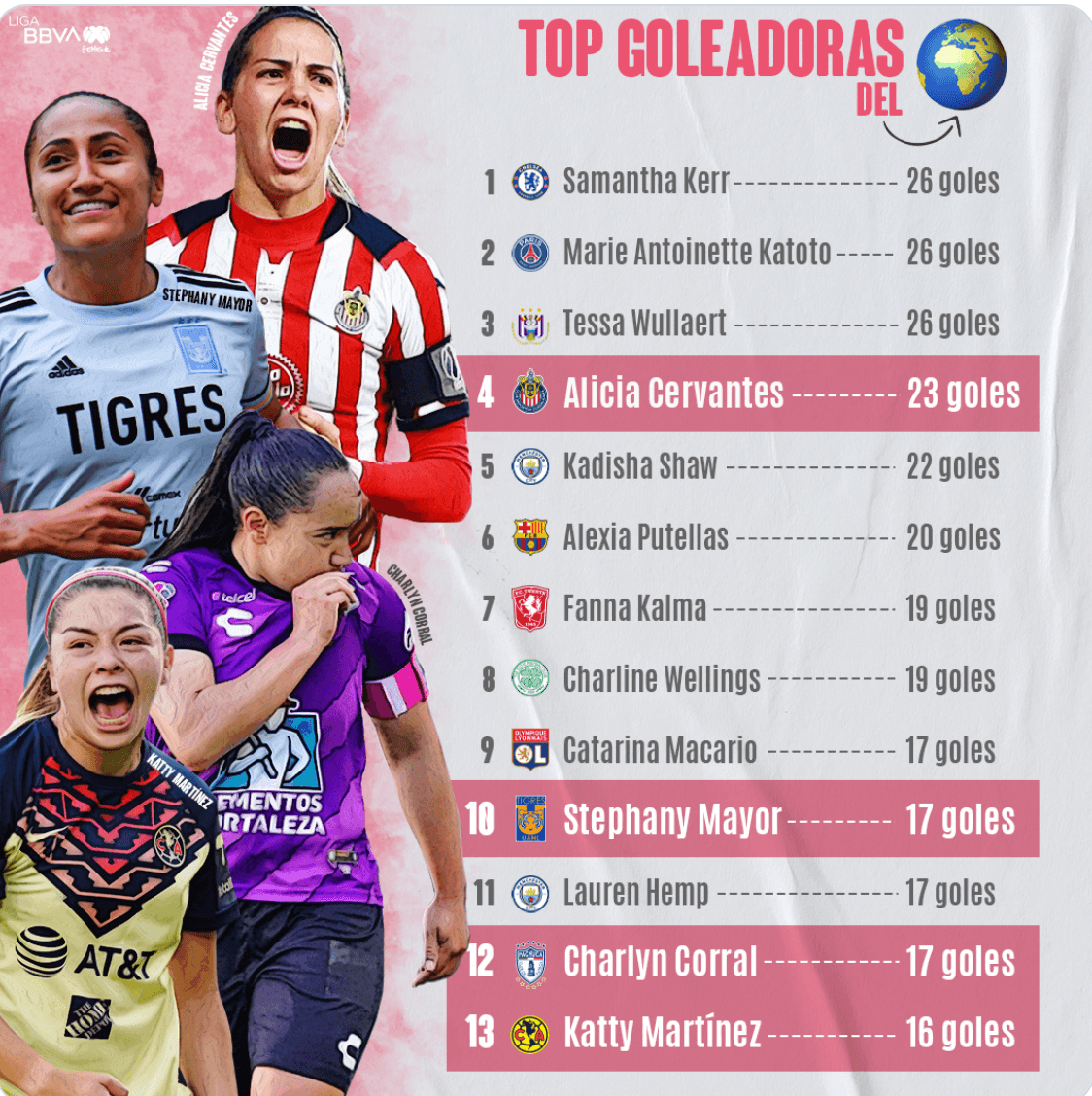 Incluso, la actual campeona del torneo femenino en México, vigente bicampeona de goleo y recientemente ganadora del Campeón de Campeones, supera a la delantera española del Barcelona Alexia Putellas, quien es la actual Balón de Oro en el mundo futbolístico femenil.