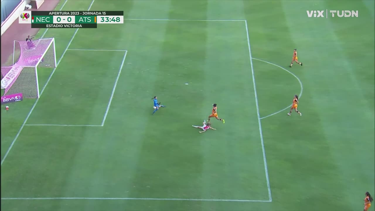 Camila Vázquez aguanta “metralla” y evita el primer gol del Necaxa, al rechazar de forma correcta la redonda.
