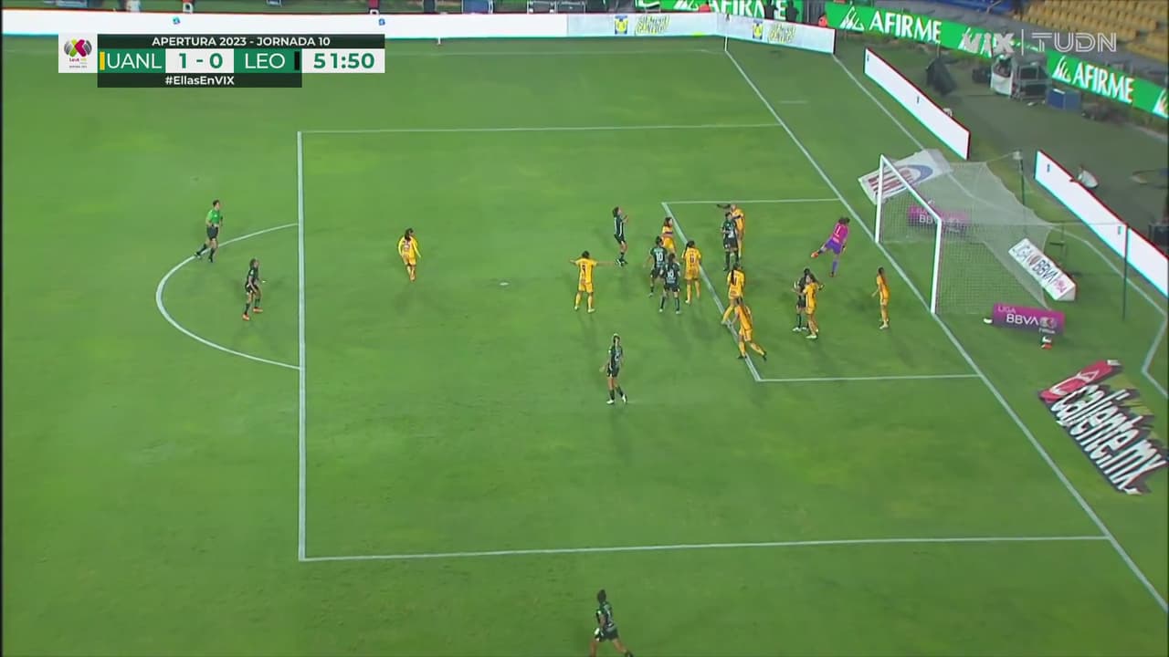 La mediocampista de León no le pega con dirección y vuela el tiro sobre el arco de Tigres.