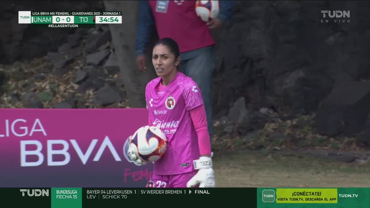 Liliana Rodríguez mandó un tiro violento, pero la portera de Tijuana contuvo el intento al 34'.