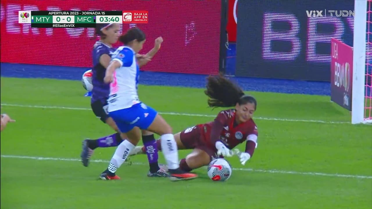 Monterrey intentó abrir a la defensa de Mazatlán por la banda, pero la portera reaccionó a tiempo y evitó la llegada.