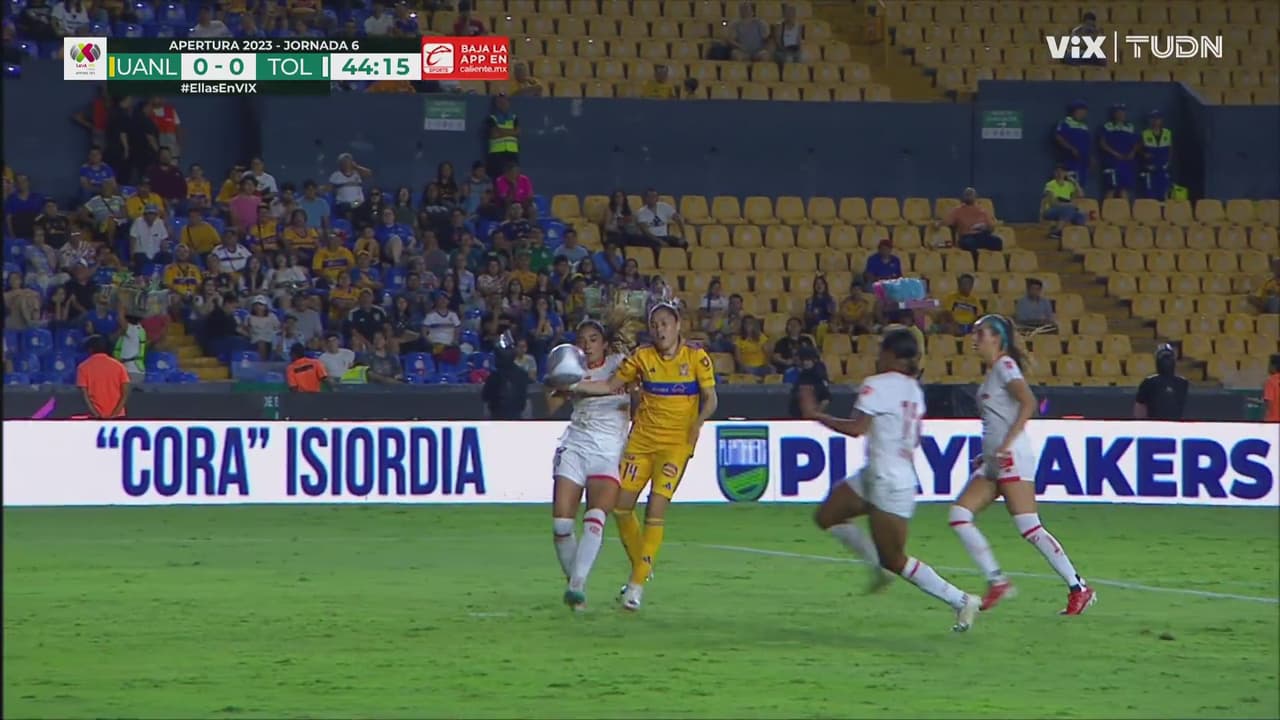 ‘La Maga’ buscaba meterle el pecho a la de gajos, cuando se cruzaron dos jugadoras de Toluca que propician su caída.