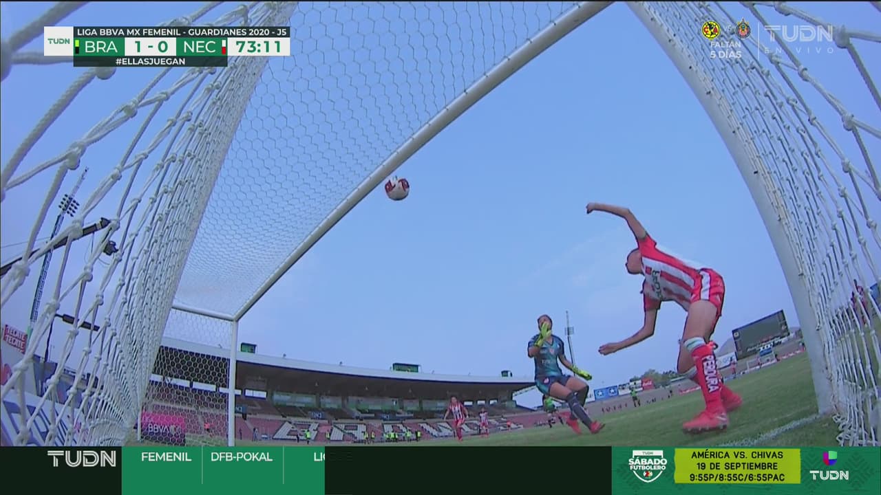 Disparo de media distancia de FC Juárez, Atzimba Casas contrarremató, Lessli Horta intentó despejar y puso el balón en el metal al 72’.
