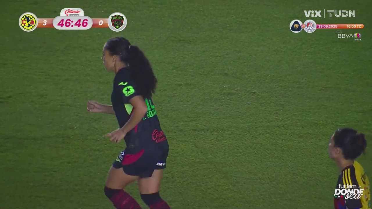 La exfutbolista de las Águilas intenta sorprender a la guardameta del América con riflazo desde afuera del área, que pasa a un lado del arco azulcrema.