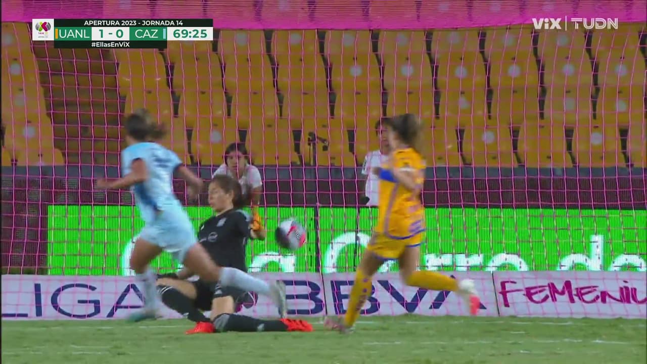 La brasileña llegó con balón franco al área, sacó el tiro, pero la portera de Tigres achicó perfecto.