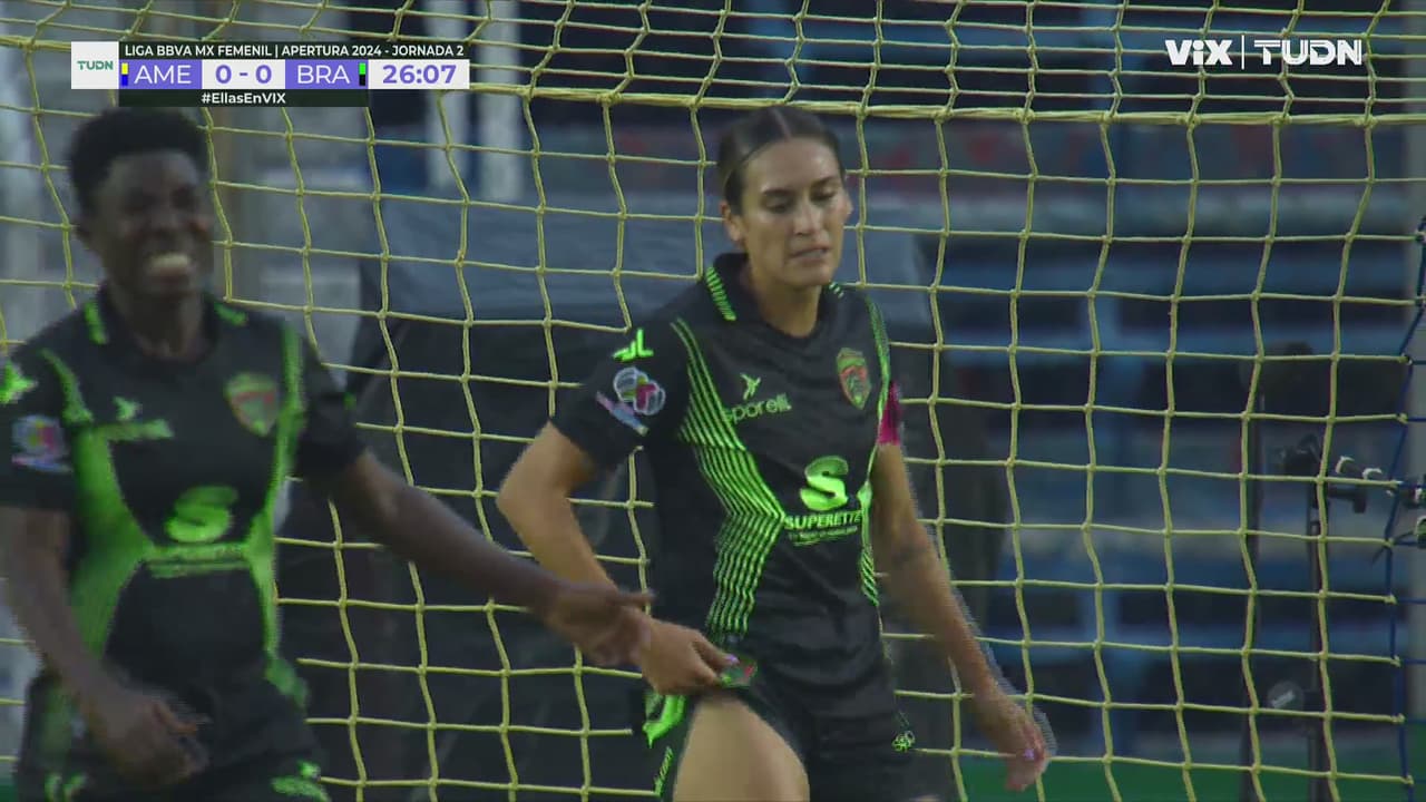 En otro contragolpe de las fronterizas, Prisca le pone medio gol a Cácerez, quien no impacta de forma correcta y la manda por encima del arco del América.