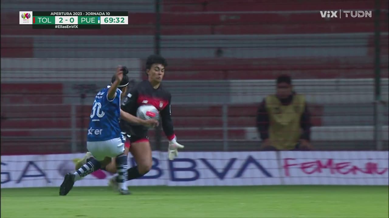 Gran robo de balón en los pies de Aisha a Natalia Colín buscando el primero de las de la Angelópolis.