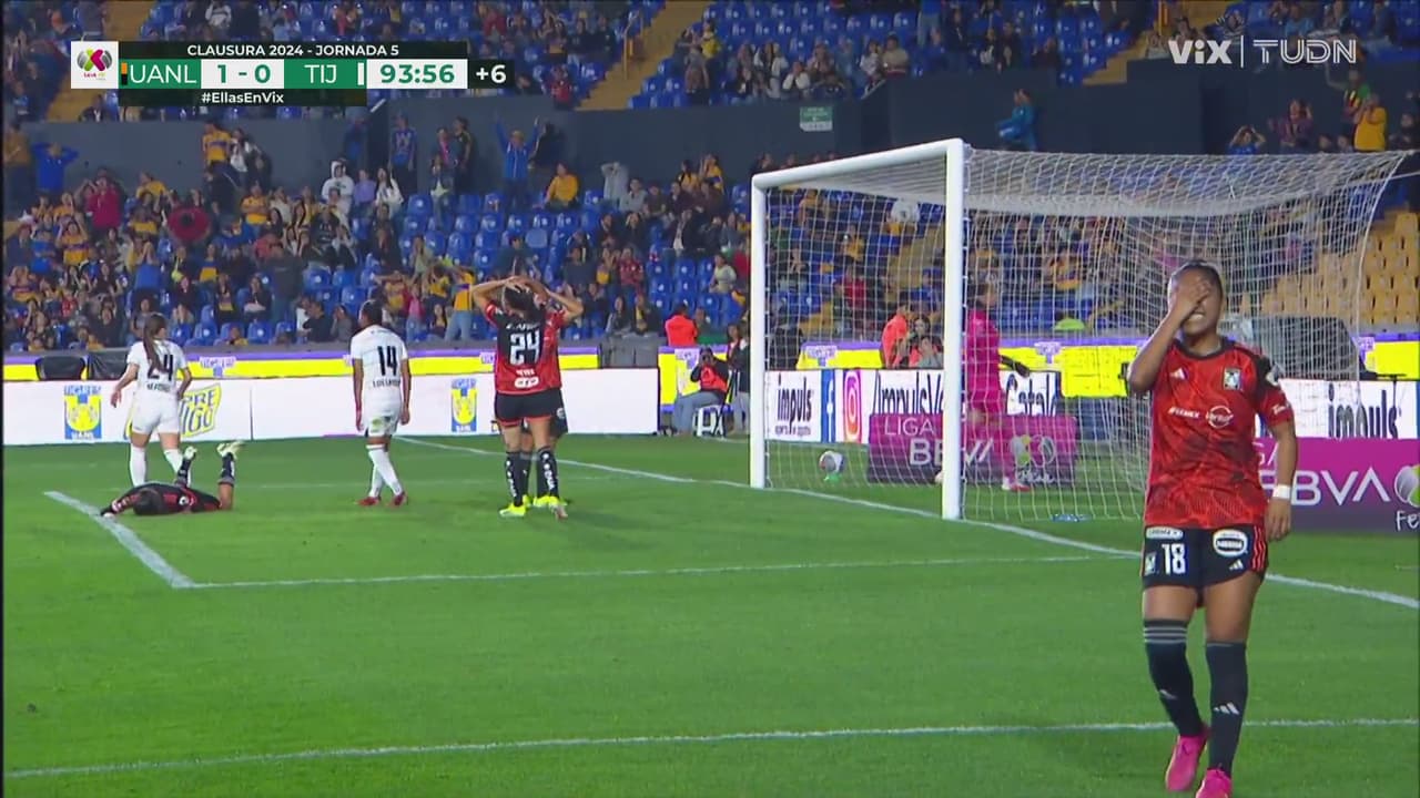 Jugada armada las felinas en donde en el último minuto, le cierran el espacio a Alison que le pega desviado.