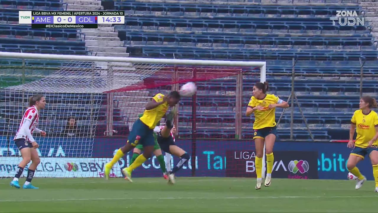 La delantera de Chivas intentó un remate de chilena y la defensa de América recibió un fuerte impacto en la cara.