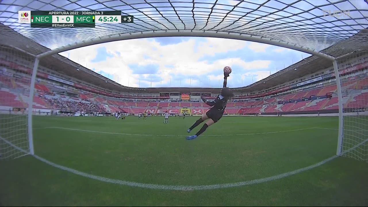 Magaly probó de larga distancia a la guardameta de Necaxa y esta reaccionó perfecto al 45’.