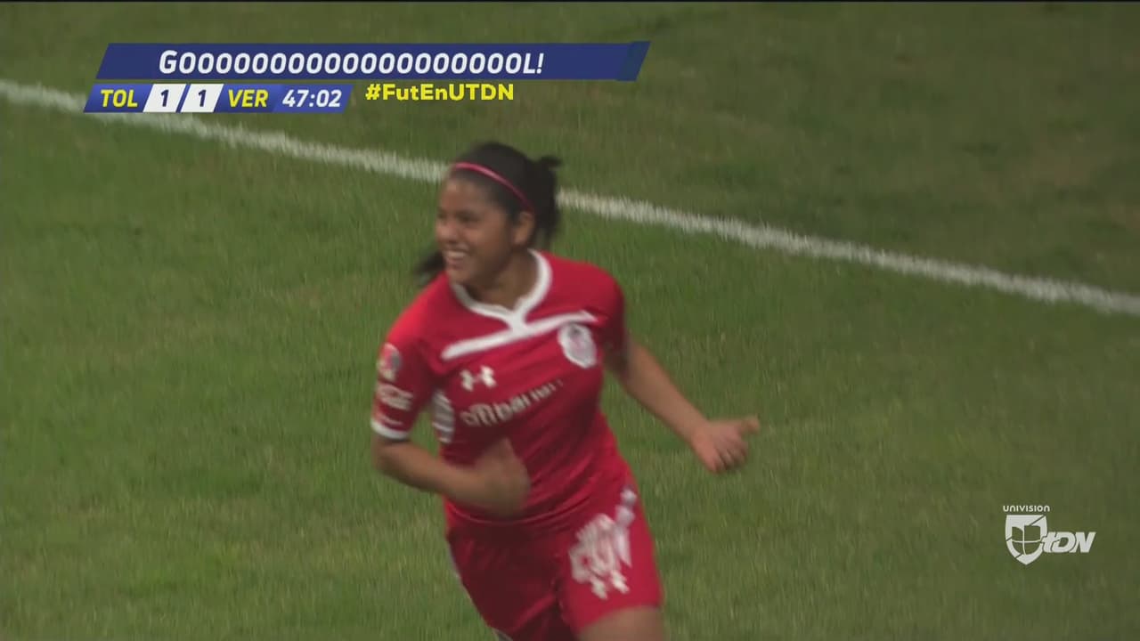 Mariel busca el balón cuando ya parecía perdido en el área veracruzano, pero un error en la defensa le permitió a la jugadora escarlata poner el esférico para el 1-1.