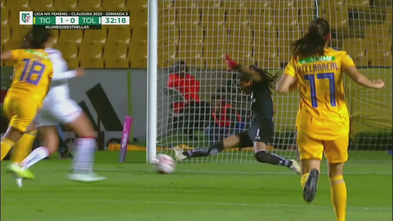 Belén Cruz, delantera de Tigres, no pudo vencer el buen achique de la portera de Toluca en un mano a mano.