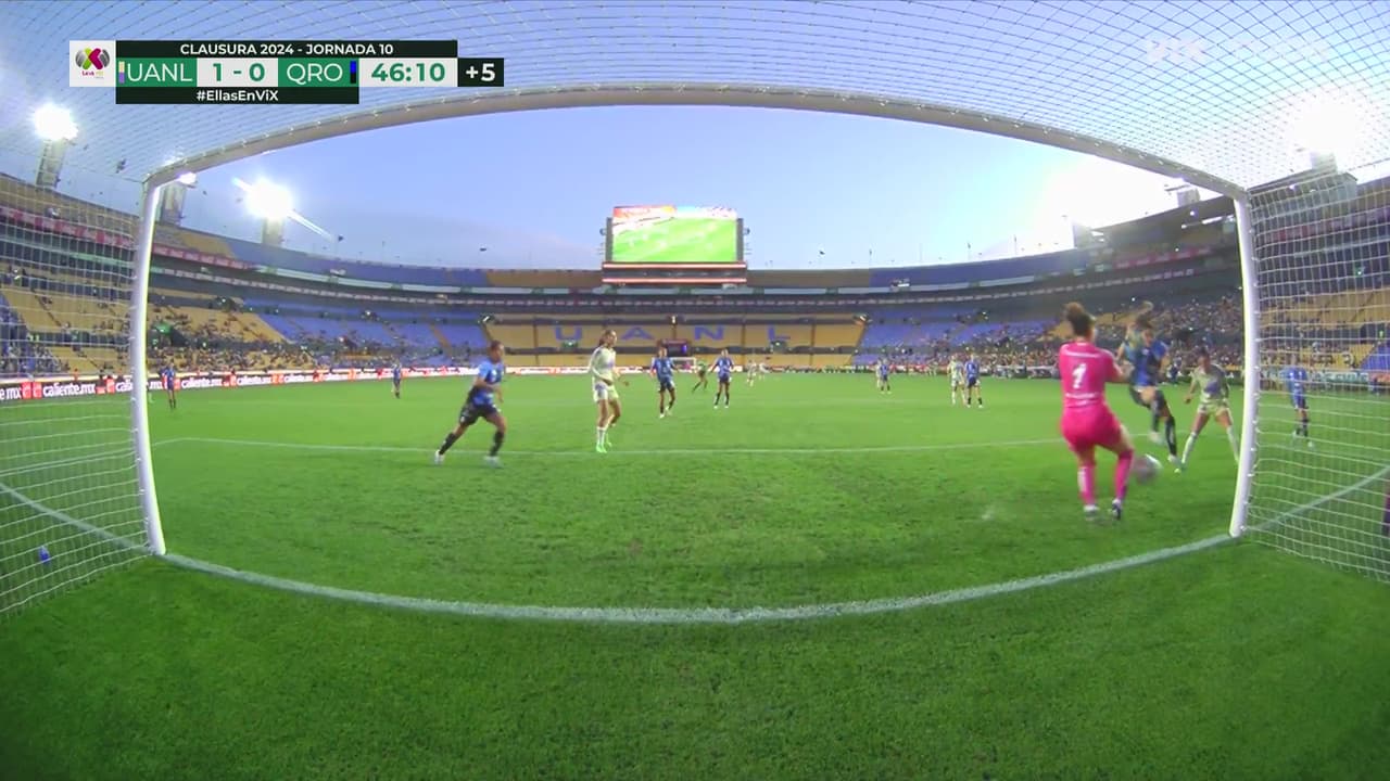La campeona de mundo confirma sus recursos futbolísticos al impactar de cabeza sobre el arco de Querétaro, en el área chica.