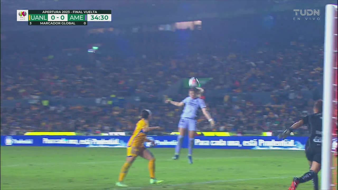 Katty impactó con la parte superior de la testa el balón sin darle buena dirección, para fortuna de las universitarias.