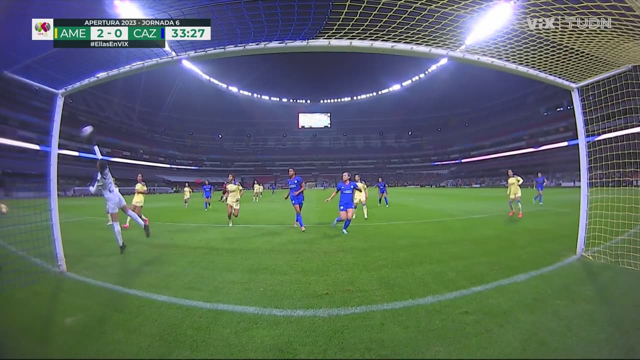En jugada de tiro indirecto, las celestes reaccionan ante la presión y la guardameta del América se estira para que no reciban el primero.