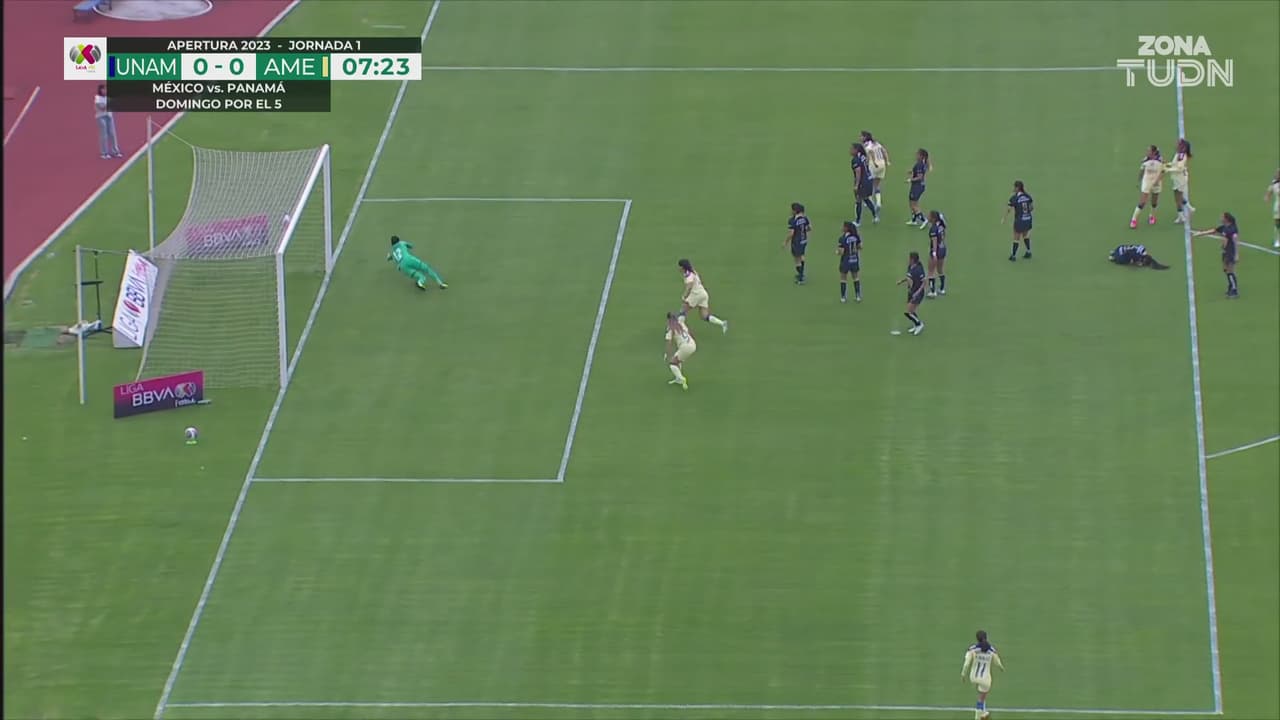 Entre empujones y una tarjeta amarilla para Karen Luna, Alison remató a portería mandando por fuera el disparo.