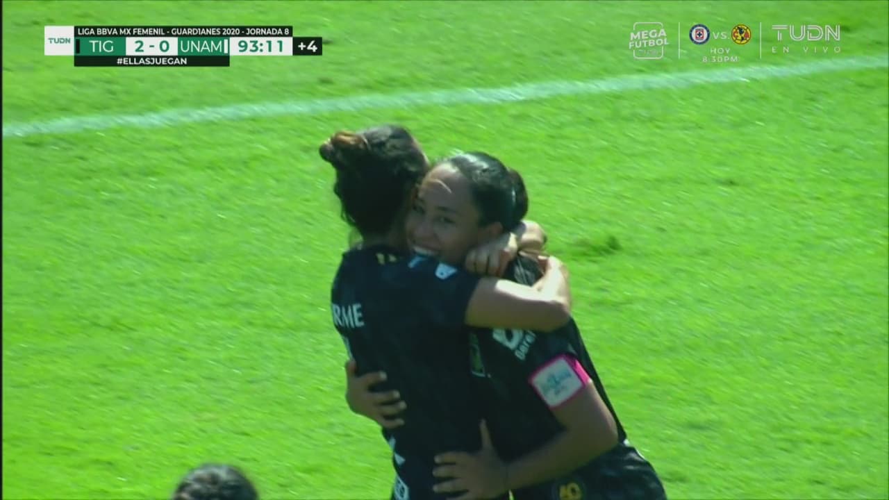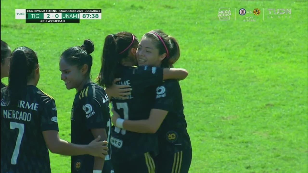 En duelo disputado este domingo en el estadio Universitario, el cuadro de Tigres femenil derrotó a Pumas femenil (4-0) con doblete de Katty Martínez redondeando por un gol olímpico de Liliana Mercado y un tanto de Fer Elizondo, en partido correspondiente a la jornada 8 de la Liga BBVA MX Femenil.