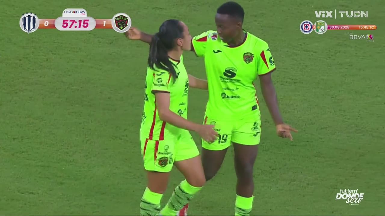 En cobro de tiro directo, la futbolista de Juárez vence a la barrera de Rayadas y también a la guardameta, para el primero de las visitantes.