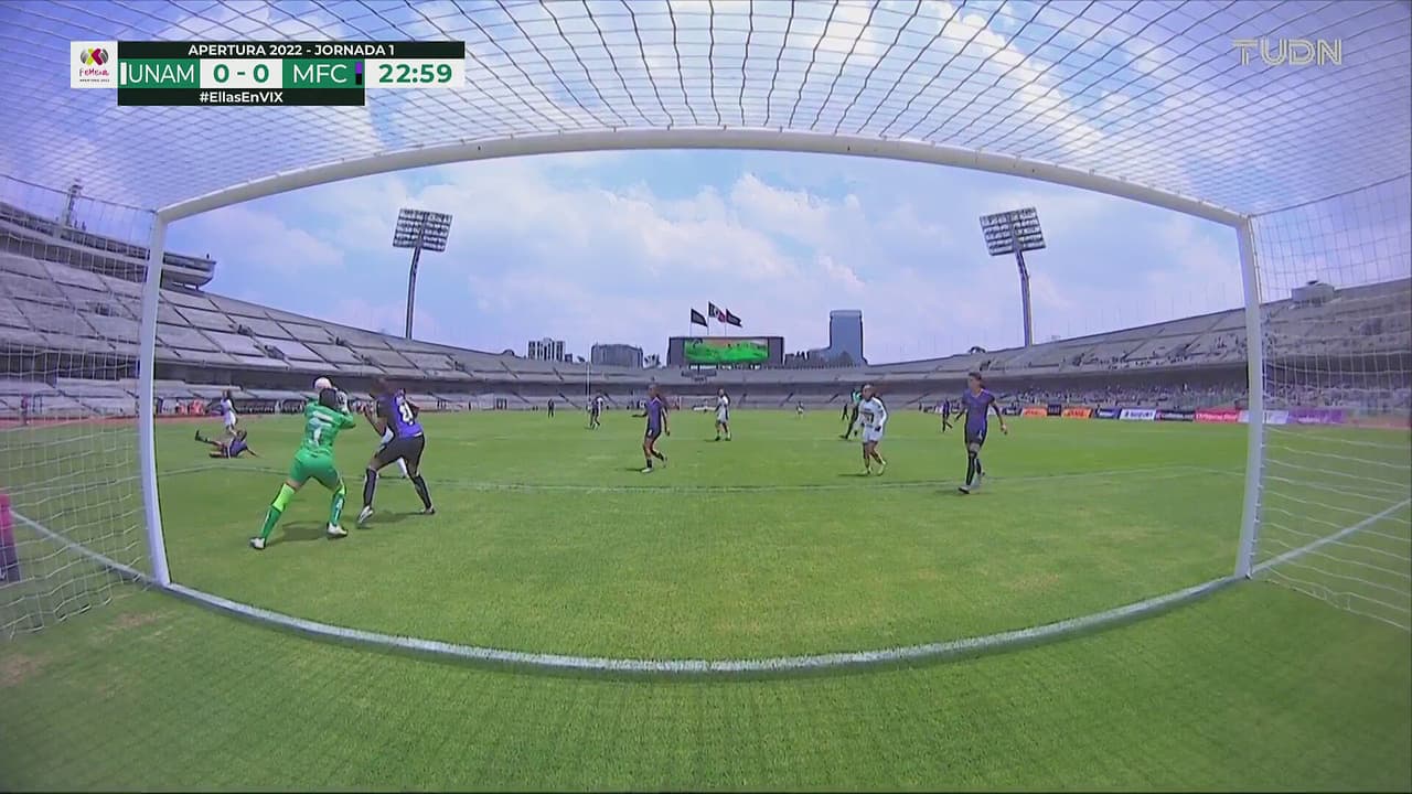 Alondra Ubaldo le tuvo que meter las dos manos para sacar el remate potente de Pumas.