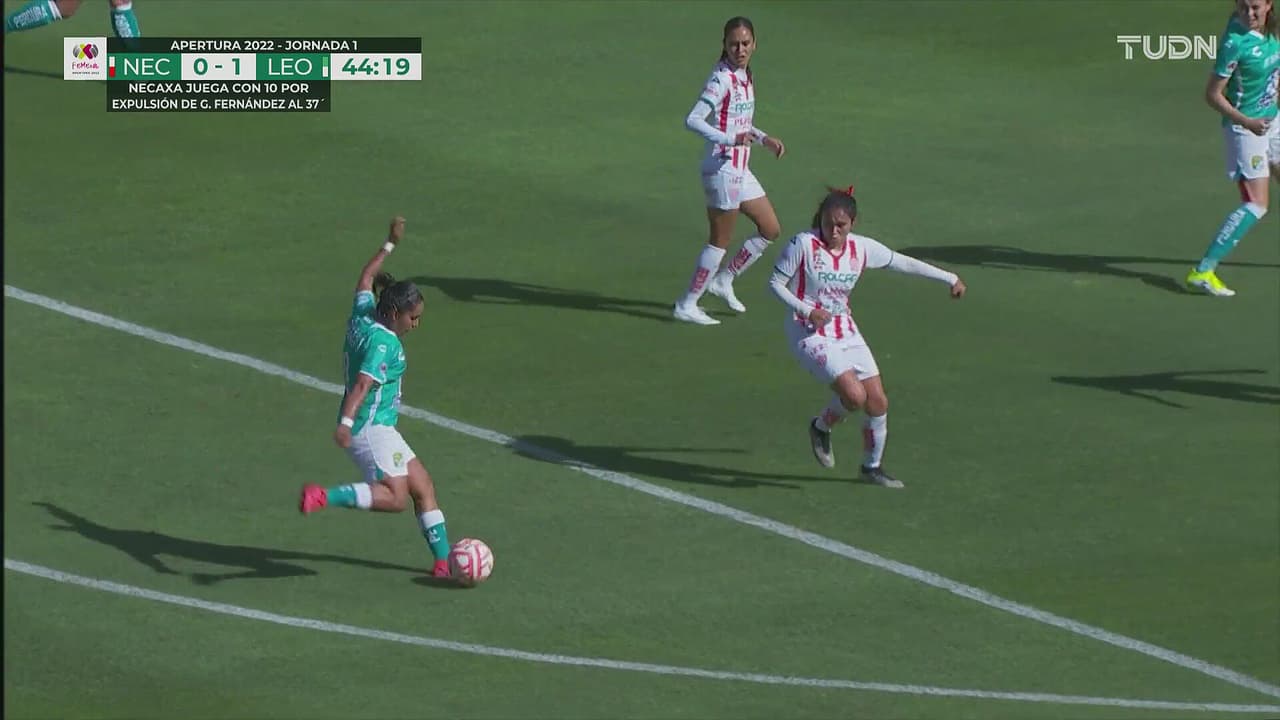 Lucero conduce desde medio campo, nadie la puede detener y su disparo roza el poste derecho.