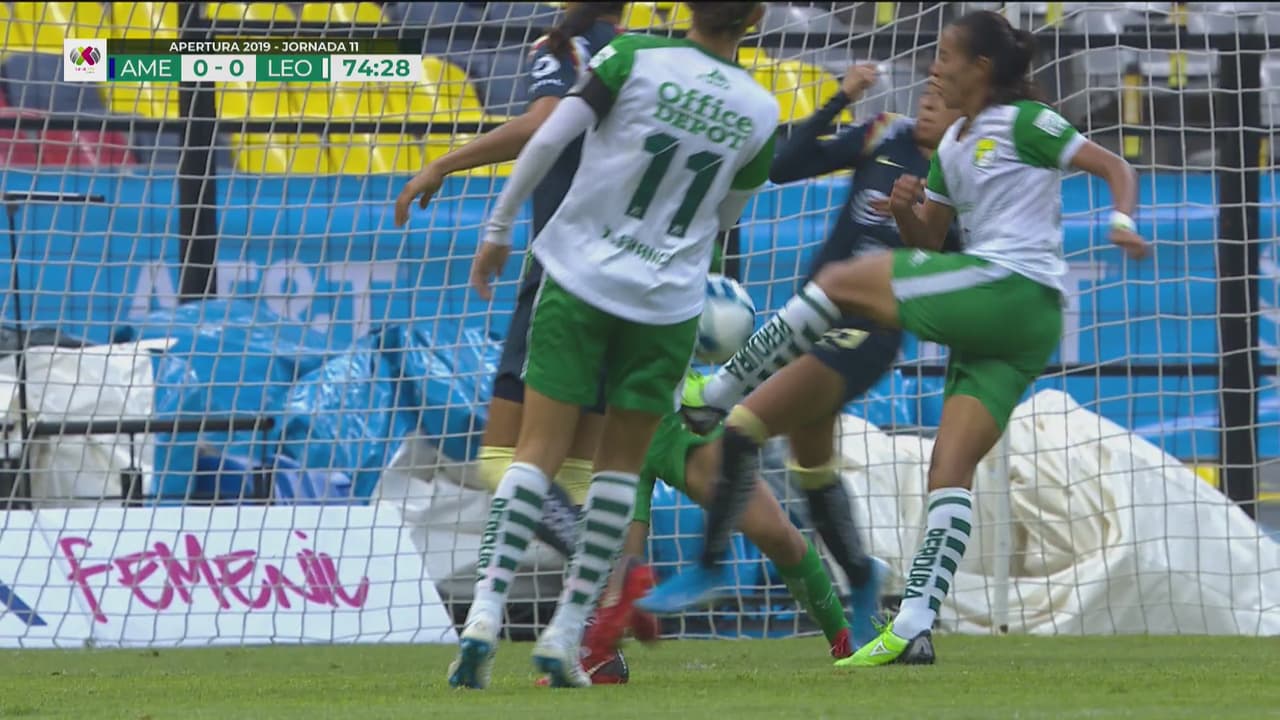 La delantera de León pifió el remate dentro del área y, al intentarlo de nuevo, la defensa del América despejó a tiempo.