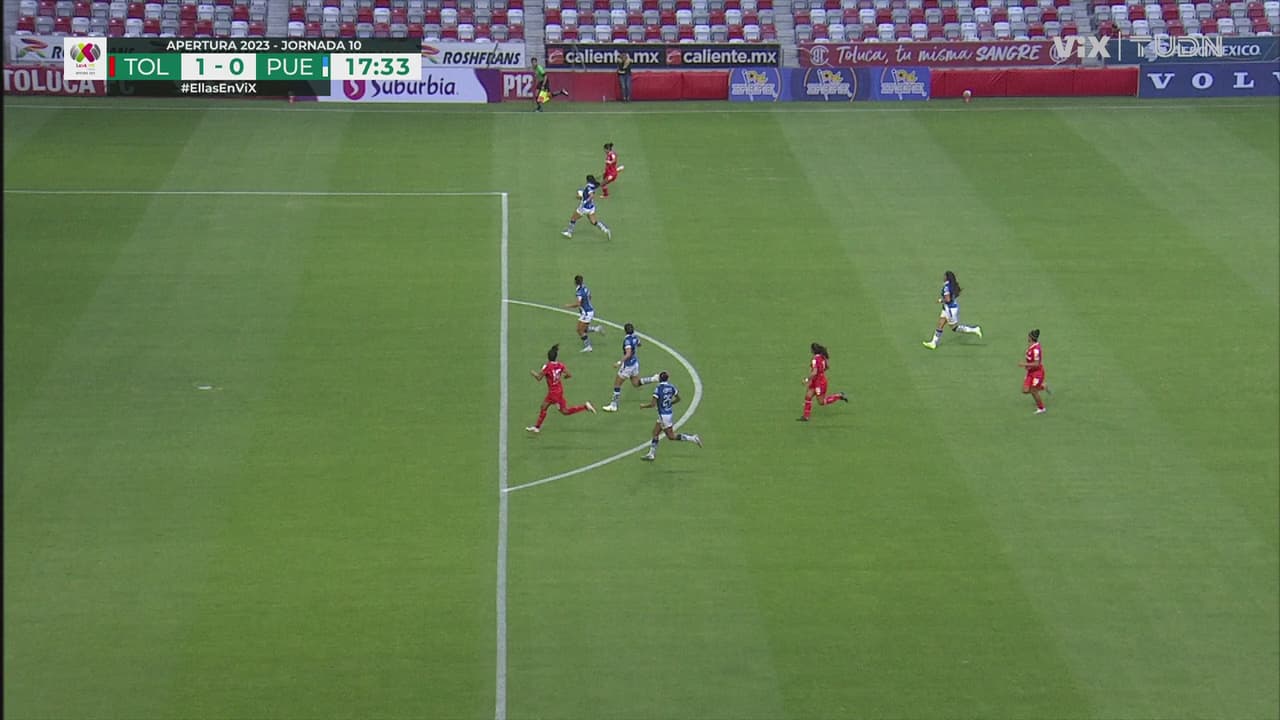 Cuando las escarlatas celebraban el golazo de la brasileña, el abanderado señala una posición adelantada de Toluca.