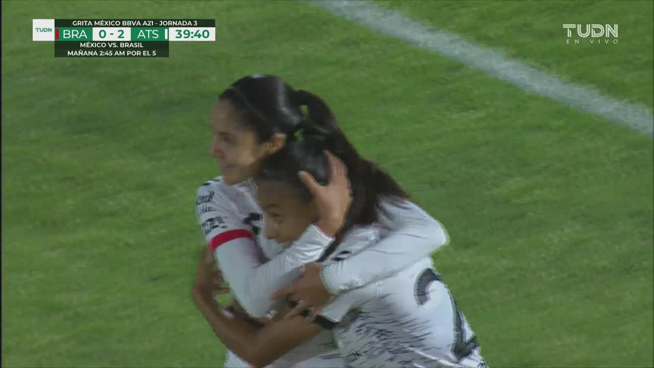 Desde la banda izquierda se lleva a la defensa y anota entre las piernas de la portera. Al minuto 39’ Atlas anota el segundo con un pase de Alison González a Paola García.