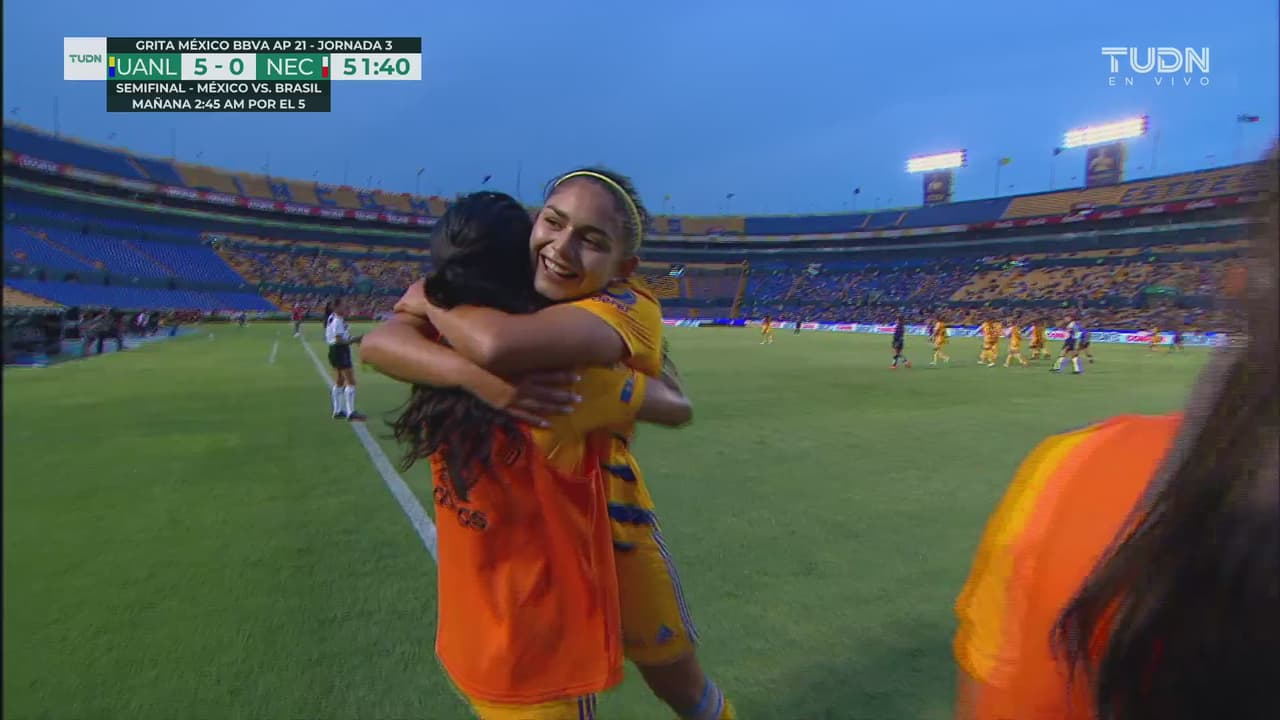 Apenas un minuto después, con un recorte de Mayor que termina rematando Patty Martínez, Tigres concluye el primer tiempo con una goleada de 4-0.